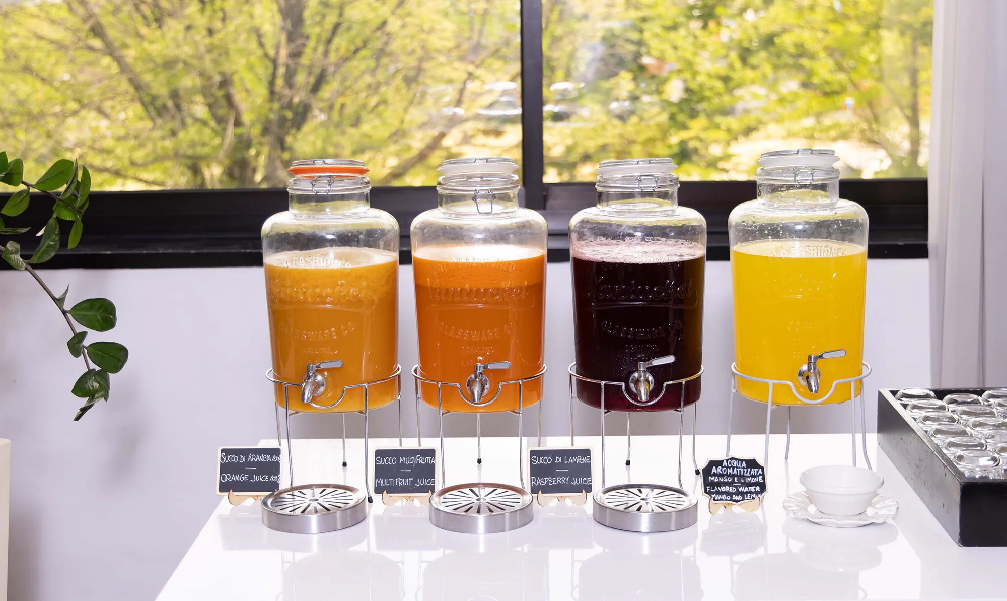Dazu frisch gepresste Säfte, Tee oder andere warme Getränke. Fragen Sie unser im Saal anwesendes Team nach den Kaffee- und Espressogetränken: Espresso, Cappuccino, amerikanischer Kaffee, Schokolade und Tee werden jederzeit frisch zubereitet.